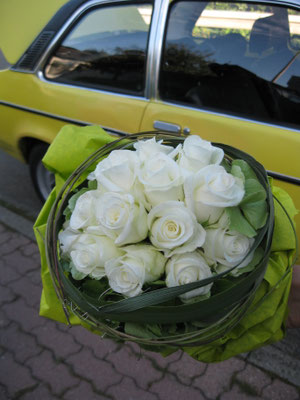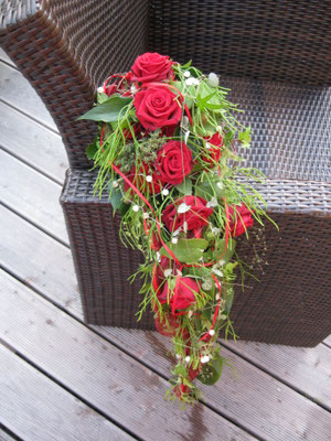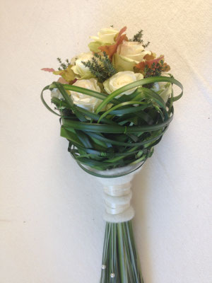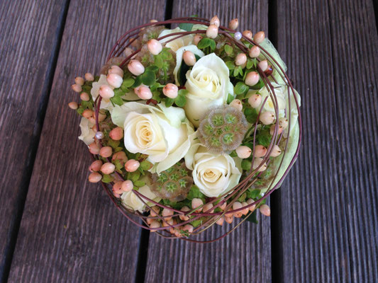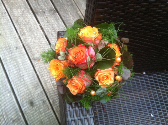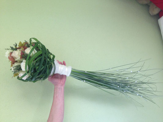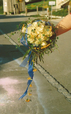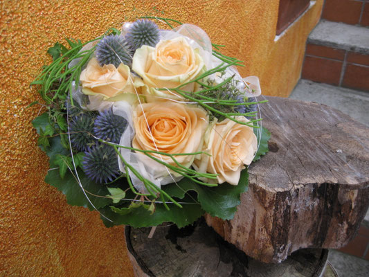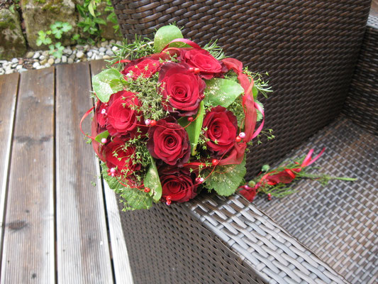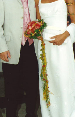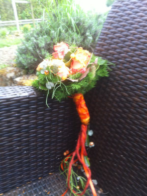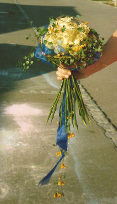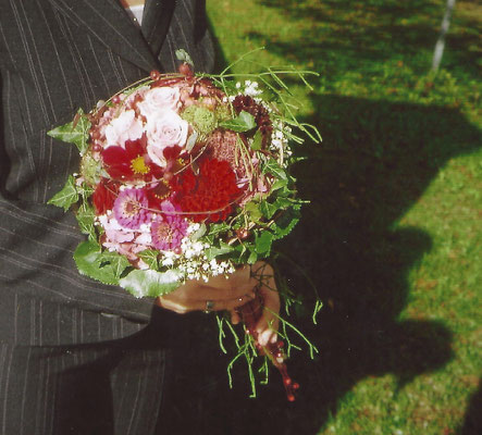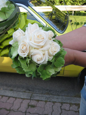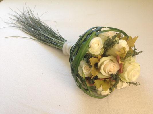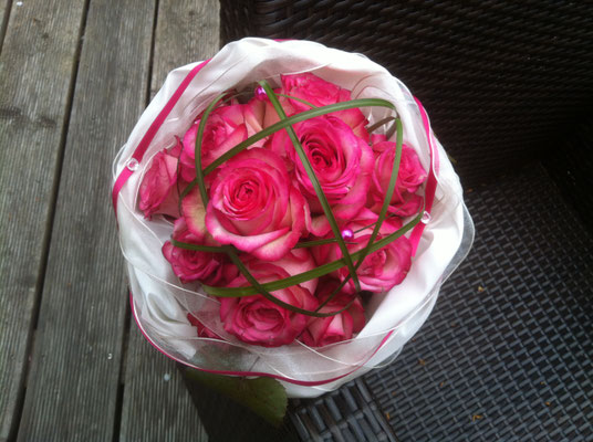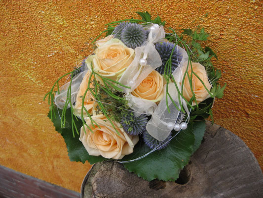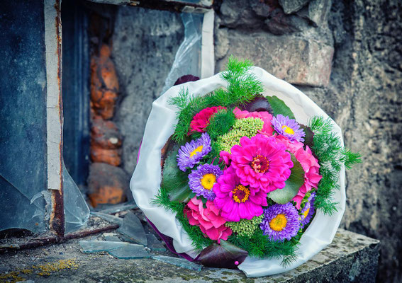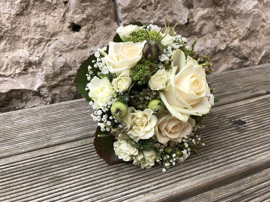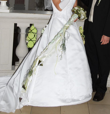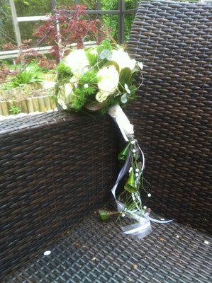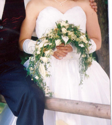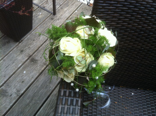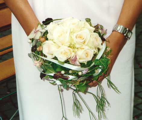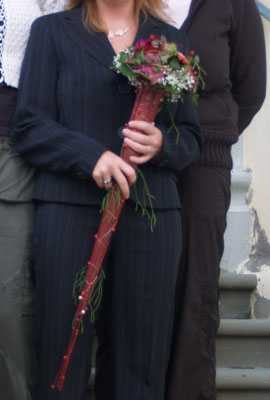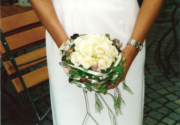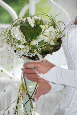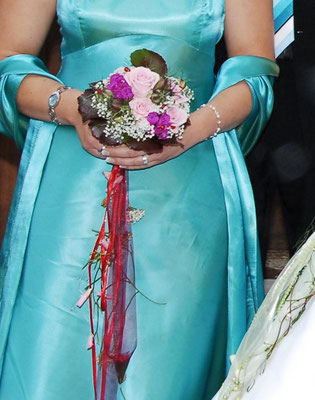 Der Brautstrauß soll von Stil, Form und Farbe einzig und alleine zur Braut passen. Er soll das Bild der Braut vervollständigen. Die Farbe und der Stil der sonstigen Hochzeitsblumen soll hier keine Rolle spielen.
